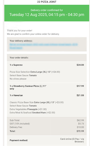 The pizzas : 8/10 (the Cajun chicken was disappointingly dry, but other than this - the pizzas were tasty - and the garlic pizza was simply awesome! The fillings were fairly sparse - and we had anchovies added to 1/2 the 22” but couldn’t really taste them - probably as slices so large one would need an entire small jar to make impact - but the taste was still up there. I would encourage to use thigh over breast as it doesn’t dry out with double cooking like breast did. The dry chicken cubes on this pizza were not enjoyable at all.