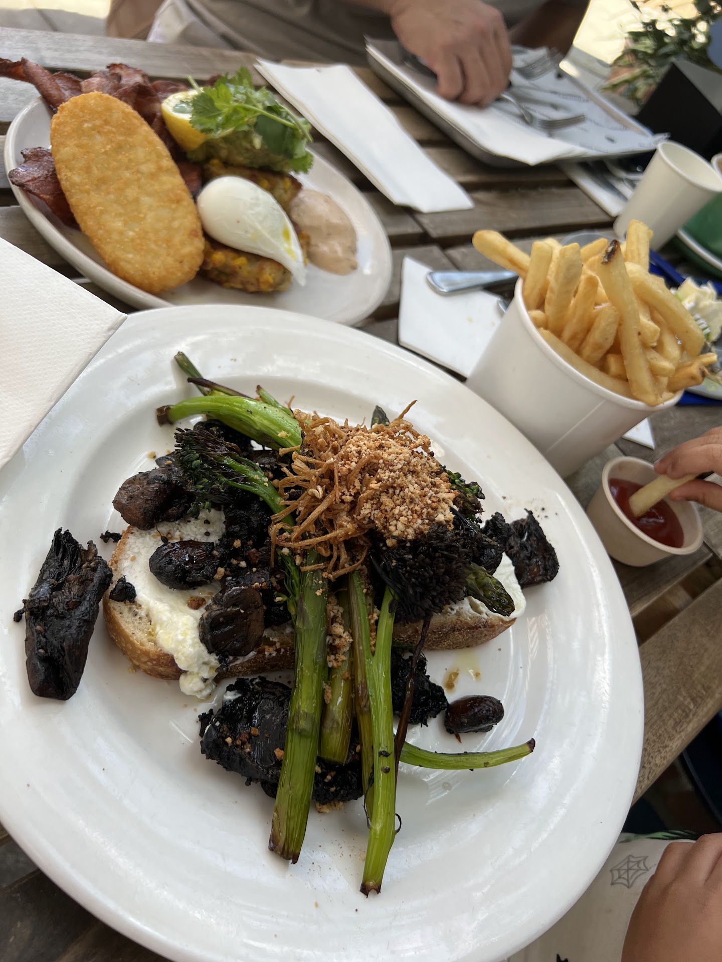 We ordered dessert first seeing as there was such a wait & it didnât disappoint! Coffee, tea & babycinno were amazing! When our food finally arrived, it looked & it did taste great but heavy handed on the spices on both of our meals that we just couldnât finish it all. Chips were great but honestly $2 for tomato sauce is a crime. Iâve eaten at plenty of places who have given me a saucer of sauce with my chips with no charge & free refill so bit disappointing considering how small the container of it was - which of course ran out before we finished the chips.