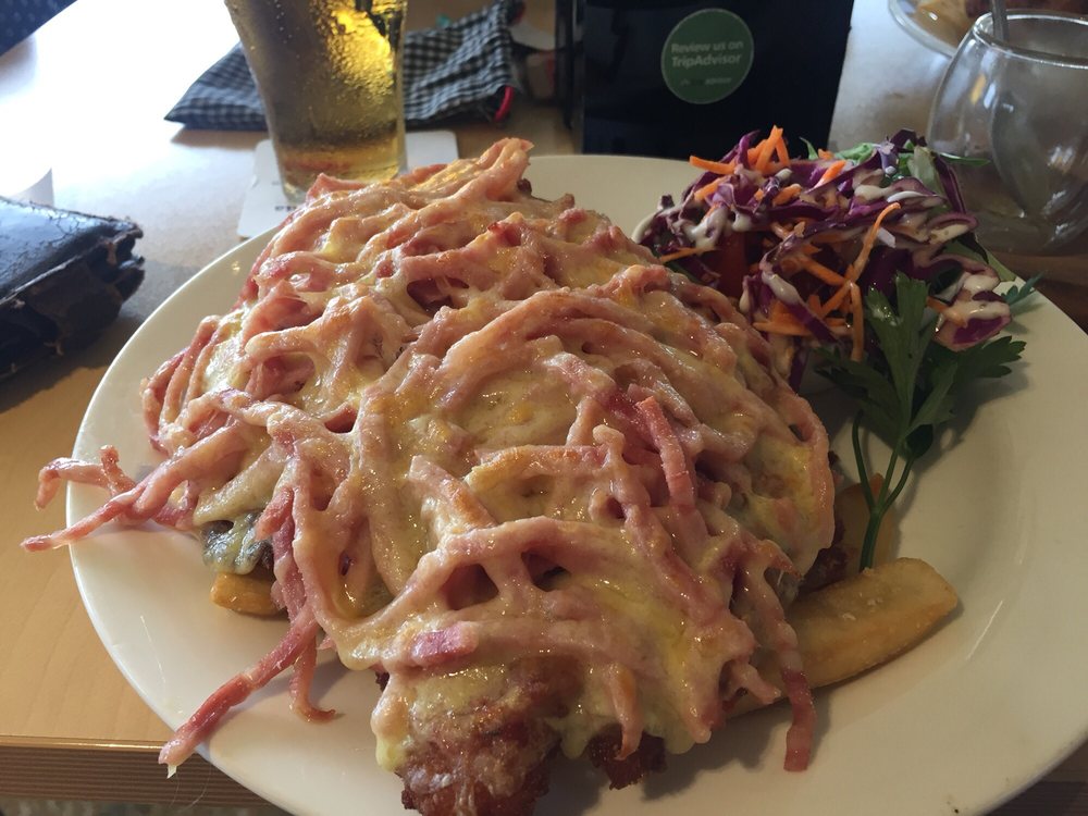 The food came and it looked good. Big portions which is kinda nice seeing the prices are pretty steep. 2 of the service staff were more polite but the rest were rude. No smiles and basic lines like reading a boring script. Quality was average to poor, and portion size does not make up for this. Calamari was OK, but slightly over cooked. My chicken Parmigiana looked very impressive but the ham was only ok, the sauce tasted old or based on a jar mixture but the chicken itself was good. Side of chips were fine but had no edge to set it apart from other parmi dishes. Side salad was not dressed - only a bit of salad cream on the top cucumber. Kids meal was fine but a little overpriced. XXXX gold is $6.05 but $4 across the street. The final kick in the teeth for me was no doggie bag. If you run a place that does large portions, I think the logic is straight forward.