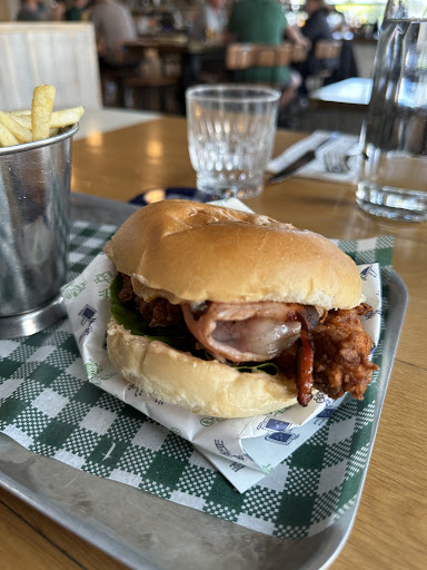 The fish and chips were fine, nicely cooked and golden. My burger on the other hand was overcooked. I ordered the fried chicken burger. It was a dark brown, super hot on the outside and overly hot on the inside. For $23 you get buns, a dollop of mayo, a piece of lettuce and fried chicken burger. It’s smaller than a Big Mac. Oh and a little silver cup filled with chips. No additional sauces...