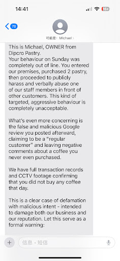 Frankly, I am concerned that this may not be the first time your business has used this kind of approach to intimidate customers. It is deeply disturbing and unacceptable. I am also requesting a formal apology from the individual involved.