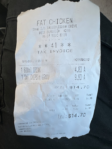 Read moreI went to fat chicken which l have not been in a while, l remembered the crunchy chips and nice chicken so thought satisfy the craving. 1st problem, 3 people working behind the counter, only 2 people waiting for food, it took no kidding around 8 minutes before l even got an acknowledgment from the young blonde girl after the guy printed her. Ok, l love with that. I did order the 1/4 chicken leg and chips, asked easy on the salt and viewed a dodgy leg 1/4 of chicken with no skin looking dry and asked if l could possibly have a different quarter as that done looks dry without skin, fine, no worries was the girls reply. Sure enough l was called and girl handed me my order and if l went. 1st thing l noticed the chicken must be down the bottom because now than usual amount of chips were on the top. I got home took the cops off the top and guess what l am blessed with, correct, the dodgy piece of dry chicken without the skin. I just remembered the girls smirk when she handed the food to me and it all made sense. So, that's my story, and if the owner reads this please feel free to respond to me as you will know who l am and think it's important for you to know how your business is being run without your presence. Thank you John who usually likes his 1/4 chicken put in the chip fryer for skin...