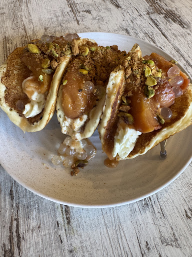 The pancakes were beautifully presented and had a fun "taco" twist, filled with caramelised peaches, cream, pistachio crumble, and popping pearls. Unfortunately, the taste didn’t live up to the presentation. The pancakes themselves were bland, and the cream was quite overpowering. The popping pearls were the highlight, adding a bit of flavour and texture.