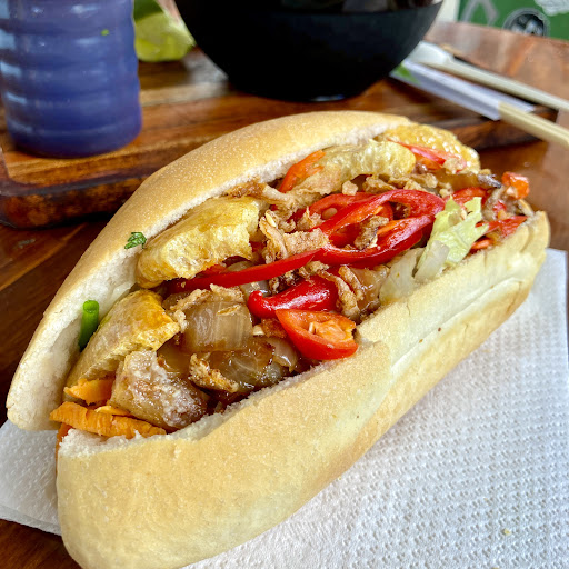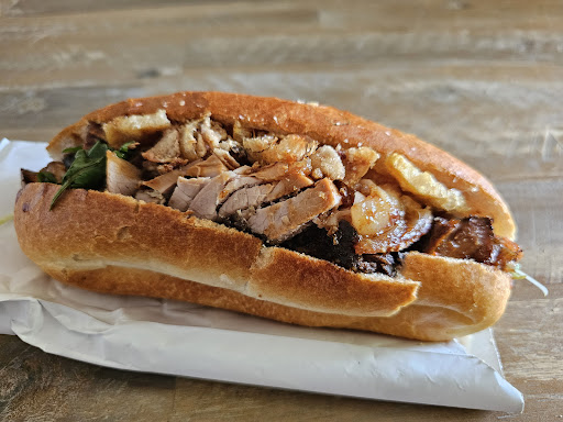 This is not a Bahn Mi - roll much closer to a bakery hot dog bun not a baguette style - might be a tasty ‘roll’ but didn’t taste Vietnamese at all. I ordered what seems to be their speciality ‘caramelised pork’ - dry (even though it was in a liquid) and unfortunately flavourless? My partner ordered a pie and the crispy pork roll - he said the pork wasn’t bad but absolutely nothing special. He also said he wouldn’t call it a Bahn Mi. Pickled veg also tasteless just didn’t notice anything flavourful about the roll.