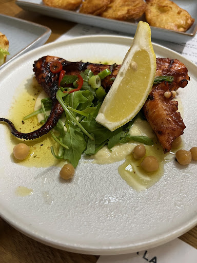 We enjoyed a wonderful celebratory lunch at Omeros Fishbar. Whilst the rating provided was 5 out of 5 the experience was not without some critical observation. The service from a lady server and a male somelier was outstanding. They were friendly, helpful, non obtrusive, thoughtful and at the same time approachable. The restaurant is obviously a step up from many but the starchiness of many staff in good restaurants was not visible in any way. It was refreshing and warming. The food we ordered comprised of scallops, fish chowder, octopus with a creme brulee to follow as well as a deep fried ice cream. Check the menu out online for a detailed description of the dishes but in summation, the food was fabulous. We ordered entree sizes to ensure our stomachs could cope with what the mind thought it was capable of. To be honest, three scallops was one too few I feel. But they were outstanding. The chowder was a little thin and not really chunky. It was more of a bisque but again, it tasted like an angels breath so it stands as an opinion and observation. The octopus has jumped to the top of my list for last meals were I sitting on death row and the hangman was standing at the door to my cell asking for last requests. The creme brulee was the epitome of sumptuousness and should have a warning issued with it stating the consumer may suffer from overwhelming feelings of joy. The deep fried ice cream should again come with a warning stating that after eating no other dessert would ever come close. And I am not really a dessert person but so pleased I relented at Omeros. The tables were clean and beautifully laid out. There is outdoor and indoor seating. We were outdoor which meant we were subjected to the noise coming from the next door fast food establishment. So chose your spot based on what style of atmosphere you would like. Overall, Impressed...