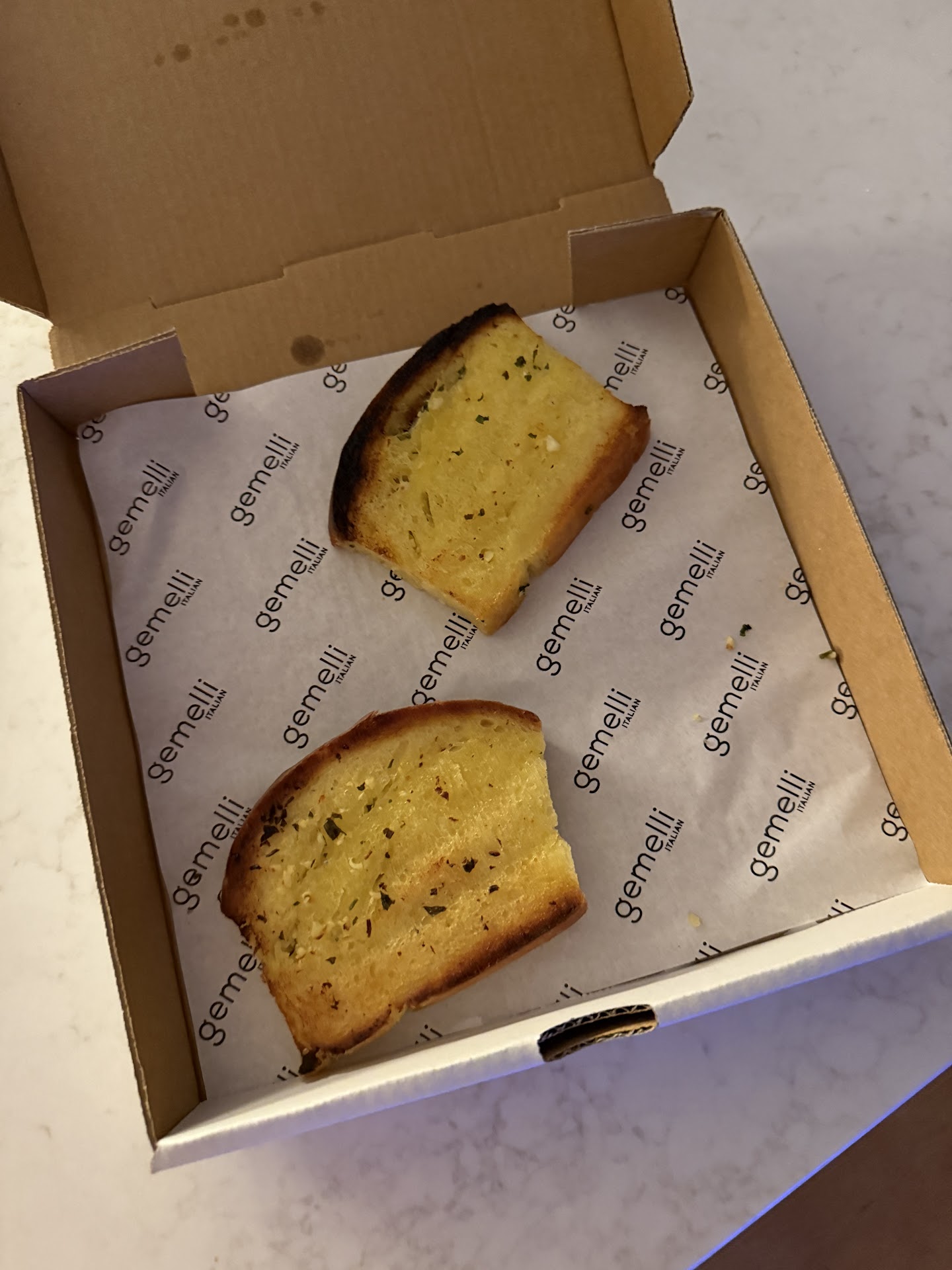 Garlic bread was advertised on the website as wood fired flat bread, mixed herbs and garlic oil. It was undesirable to say the least. 3 pieces of garlic bread for $18.