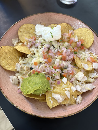 Now, onto the food. Calling it “nachos” is a stretch. Imagine a pile of dry corn chips topped with a smear of refried beans, about ten lonely black or kidney beans buried in the second layer, a sad dollop of that processed Subway-style green guacamole, and a dollop of sour cream (the only vaguely redeeming component). Oh and the “chicken”? Chopped chunks of what looked like grey, processed deli “meat style” loaf. Most of it we didn’t dare eat.