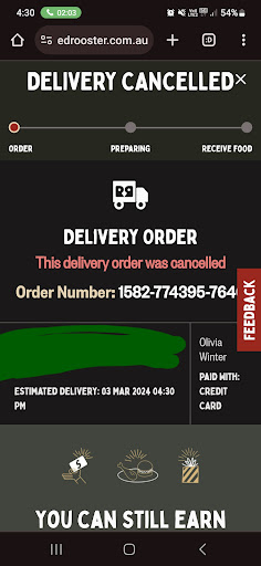 DO NOT ORDER OFF OF WEBSITE. (Probably just don't order here at all tbh) I wish I could rate the food but, I never got it! I ordered $45 worth of food to be delivered 11 days ago, after waiting half an hour my order was canceled by red rooster. I called to ask what was going on and was told they would look into it and call me right back, after waiting half an hour with no response I decided I would call again and ask what was happening. Again I was told that they would call me back. After another 15 minutes (I ordered over an hour ago at this point) I called once again and was told very rudely that there was nothing they would do about it. Excuse me? I have paid your company for food to be delivered to my residence which was canceled by YOUR company, and there's nothing you can do about it? She said I would be refunded (I haven't). I told her I don't want a refund right now I want my food?! Apparently the restaurant isn't capable of making replacement food and sending it out? I've complained through the website and received a $20 voucher?? I don't want a voucher, now I want my money back? I've responded and been ignored. I've called them twice now and been told I have to go to them if I want my refund. I ordered DELIVERY because I live an hours walk away. I told her this, and she just said there's nothing she can do about it. I keep being asked by the staff which app I ordered off? Your website! Absolutely disgusting, give me my money back. I have paid this company for goods, I didn't receive those goods. At this point its theft. (Green scribble is the delivery address) Editing to add the response below telling me to submit feedback via the website is an absolute joke considering I have already done this and was given a $20 voucher (as stated above). I responded to the email I was sent from them with all of this information and they never replied. Why should I have to keep chasing this up?? Why do I have to continuously put through feedback? Your company has stolen my money? Reply to the email I...