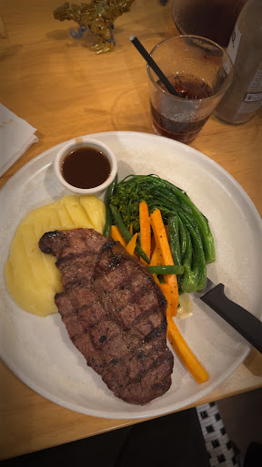 Read moreDisappointing and overpriced. We arrived and asked to be seated - the waitress waved her arm and said to just sit anywhere and QR code to see a menu. So we chose our table (note all tables are on wheels and we spent some of our time here stopping the table rolling away) and placed our order - garlic bread and a steak each. The garlic bread arrived - it was a puffed up roti type bread swimming in a huge amount of oil. I asked if we could have side plates to eat this from which was met with a look of incredulousness. The bread was virtually inedible due to the amount of oil, but what we could eat was ok. Our steaks then arrived a short time later . I had asked for a medium cooked steak with rosemary jus - I received a very rare steak with mushroom sauce (using tinned mushrooms). Luckily this wasn’t my husbands plate as he is allergic to mushrooms. I ate as much of the steak as I could - it was a good cut of meat , just waaaay undercooked. Veggies were fine. Husbands steak was cooked ok (well done as opposed to medium to well as requested) and again was a good cut. Again though, plates were swimming in oil and were very unappealing. We were starving and got through most of our meals although suffered later that night with upset stomachs. Would not recommend - there are plenty of better...