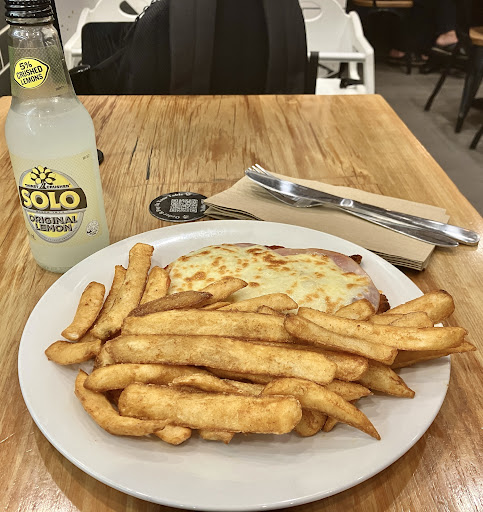 2 registers 2 staff no acknowledgement whilst in line. 1 serving taking orders and the other printing out dockets and stabbing to pin. No eye contact, friendly gesture to say sorry folks won't be a minute etc. We took our seat and number and couldn't sit at back part due to staff sitting there on break. Ordered an OMG but after taking our seats a friendly and polite staff member came over to advise they were out of bacon. With the kitchen 2 metres from the register where orders are taken, I would expect this to be communicated easily. She offered to fry up some ham, my partner agreed. My schnitz 15.90 was tiny and had a cut in it to check if cooked I can only assume.. with the small size and thinness of the chicken (I guess 15.90 worth or at least half with the nice chips they had) a chef or small order cook at the least wouldn't need to do this.. leaves presentation poor. Food being prepared left on make bench far too long waiting for chips and chicken to cook. Multiple people taking their orders back. Sorry but not good enough. 2 stars but mainly for the battered chips. Hopefully a better experience for...