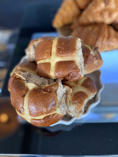 The menu is relatively short, with sandwiches, eggs, acai bowls and avo on toast. But the food is good. We both order the scrambled eggs on the most amazing bread around, and a side of sweet tomato relish. Before we leave, we also grab a hot cross bun for later, light fluffy and super tasty.
