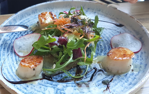 We enjoyed a wonderful celebratory lunch at Omeros Fishbar. Whilst the rating provided was 5 out of 5 the experience was not without some critical observation. The service from a lady server and a male somelier was outstanding. They were friendly, helpful, non obtrusive, thoughtful and at the same time approachable. The restaurant is obviously a step up from many but the starchiness of many staff in good restaurants was not visible in any way. It was refreshing and warming. The food we ordered comprised of scallops, fish chowder, octopus with a creme brulee to follow as well as a deep fried ice cream. Check the menu out online for a detailed description of the dishes but in summation, the food was fabulous. We ordered entree sizes to ensure our stomachs could cope with what the mind thought it was capable of. To be honest, three scallops was one too few I feel. But they were outstanding. The chowder was a little thin and not really chunky. It was more of a bisque but again, it tasted like an angels breath so it stands as an opinion and observation. The octopus has jumped to the top of my list for last meals were I sitting on death row and the hangman was standing at the door to my cell asking for last requests. The creme brulee was the epitome of sumptuousness and should have a warning issued with it stating the consumer may suffer from overwhelming feelings of joy. The deep fried ice cream should again come with a warning stating that after eating no other dessert would ever come close. And I am not really a dessert person but so pleased I relented at Omeros. The tables were clean and beautifully laid out. There is outdoor and indoor seating. We were outdoor which meant we were subjected to the noise coming from the next door fast food establishment. So chose your spot based on what style of atmosphere you would like. Overall, Impressed...