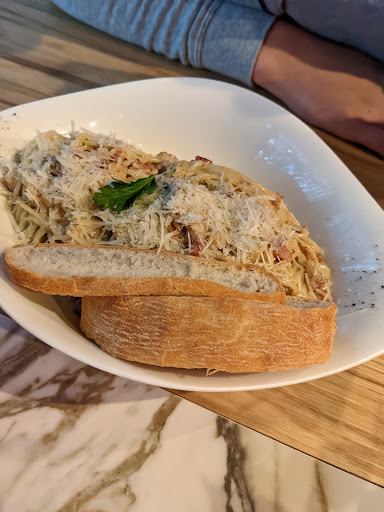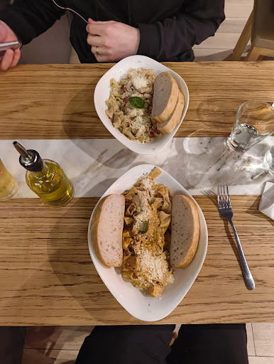 Read moreHappy to see this little restaurant has finally opened to add to the chain of restaurants they have popping up everywhere!! We had a choice of seating and due to ordering a taster of a few things required two small tables to fit everything on!!Minutes into settling the floor manager???wanted to take a table from us to accommodate a big party of people even though half the restaurant wasn't open,being used or overly busy!!I said it wasn't really convenient so they made alternative arrangements with the seating..If they were VIP then a table should have been reserved!! We started with cheesy garlic pizza which was lovely..I had Prawn gamberi fettucine,unfortunately I only had a choice of 2 types of pasta but a choice of two sauces!!my daughter had carbonara,all was enjoyed . The prawns were plentiful and a good serve tasting fresh and well cooked!!a bit on the greasy side but otherwise a tasty meal.The carbonara was plentiful a touch saucy but much preferred than stodgy and dry!!drink choices a touch limited but managed to find a likeable rosé (their only one)to compliment my meal.Due to it being very new opening staff were trying very hard to impress which was good to see,except one particular waiter became a bit of a nuisance asking about the meal every 10minutes,a bit over zealous!!all in all will go back again by then I'm sure the menu will be perfected by then. FOOTNOTE:Have recently returned for a late Lunch/Early dinner..We had the Carbonara,Prawn& Spinach with a cream base this time!! I feel it wasn't as good as the first visit ,hopefully the chefs haven't become complacent!!The choices of pasta for the seafood dish,again limited, would go very well with a angel hair or linguine(a fine pasta)..the pasta wasn't al dente at all, very stodgy,the cream quite gluggy and had thickened to a degree it was a touch sickly!! Not my first preference of this lovely little franchise,never the less a decent meal...