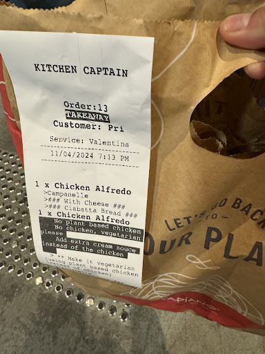 Read moreI order 2 pasta, one chicken Alfredo and one vegetarian Alfredo which is I strictly gave instruction to the lady who took my order that I don’t need chicken even though I don’t need plant based chicken and Can I replace chicken with anything else and she said yes and showed me few option and I select extra cream something. When I get my order and I opened that I saw there is plant based chicken in my vegetarian pasta. I called them and asked them to replaced. I went there there is Indian chef who was showing me that it is writing something else in the bottom that’s y he add plant based chicken. The lady who took my order saying that she is manager, I have no clue if she is manager or not or she just making up, because rather then handle that situation, she just walk out. She did a mistake or chef did a mistake in Al off that My time & money was wasted. When I left the store whole staff was laughing near to the food counter. I am from Indian background and the chef I think he is Indian too and was so racist with their own country people , he makes the other food like there is no taste at all. I paid for that stuff, and it doesn’t mean I return the food (which is staff and chef mistake) then you guys make taste less food for the replacement. Thank fully I didn’t eat that food other wise I will sue these people. Rubbish attitude. Anyone can read this receipt will confuse one place you can see with No plant based chicken and no chicken and the bottom you can see with plant based chicken. If the lady had any confusion she can asked me that time but these receipt can confuse any other person who is not working there (customer). with the food instruction they should look into more. Because if people give instruction while ordering food they should listen rather than making faces. Because of there stupid attitude any one can suffer serious problem. And chef have to know that if he gave first food takeaway with good presentation and good quantity then how he gave less quantity and without cheese food in the replacement?? So much...