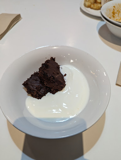 The salad bar was filthy and chocolate mousse had looked like it had been smashed around, our question was why had not the old lunch service food been removed after 1.5 hours when they had no one one in the dining room?