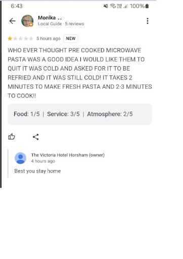 Your reply smells of self entitlement, you really have no idea who i am and your answer does not address the issue. I was bought up in Horsham and was visiting a family member (by the way we are massive in size, and i mean that in the amount of family) This Hotel used to have fantastic meals (that's why i came there) There were 4 of us and none of us were happy with the meal. My wife even put one in of her own to which your reply was, you should have stayed home. Not good enough, didn't even try to address the problem. People go out to have a meal for a change and expect good food when they go to a place to eat. Not only does your reply to both my wife and my self lack any real response, it is simply not good enough in any industry to answer the way you have. My cousin who still lives in Horsham will start contacting our immediate family and the word is going out to stay away, this only hurts your business, but hey you bought it on yourself. Whilst ever it stays in your hands we won't be back, plus hundreds more. ...