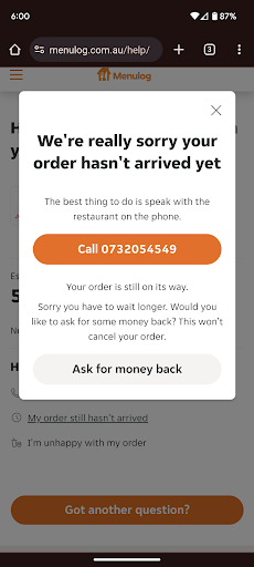 Read moreAfter waiting 45mins (after the original delivery time I had selected) for my order to arrive Menulog offers a partial refund for waiting so long.