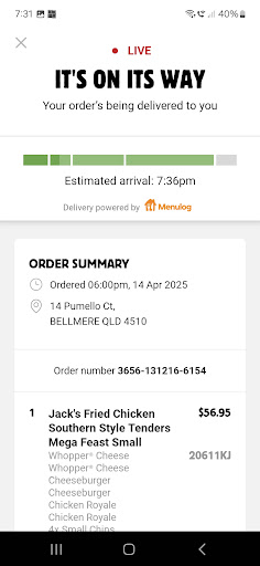 Read moreOrdered through UberEats. Received order which was missing majority of the meal and only got burgers & drinks. We then drove 40 mins round trip as we just wanted the food reheated and to be provided with our missing food, which HJs was at fault for not providing/checking before passing our order to UberEats delivery driver.