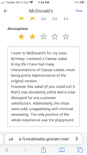 Ā Ā Ā Read moreI could go on and on about this place. Having worked a fast food job in the past, I canāt comprehend how this store is so notorious for missing items in orders. Are they even trying to read the order? Normal nuggets instead of spicy, fries instead of apple slices, vanilla coke instead of coke no sugar. How does it go so wrong? The service is atrocious, the girls that work there have so much unnecessary attitude. I was given a drink the other night and the lid hadnāt been fitted properly, so when taking it, it spilt all over my lap and in the centre of my car. I called back over and over again asking for help and was ignored by the girl until her coworker pointed me out. She then took the drink off me and gave it back with another lid, leaving me still covered in soft drink. When asking again for a napkin, she didnāt say anything and passed me a handful of napkins, no apologies, no offer for another drink now that I was wearing half of it. The staff here treat you like youāre an inconvenience, when their job is so simple and minimal effort is needed to be a nice person. And lastly, the food can be terrible. Everything is always deep fried to the max and dry, hard and chewy. The stores in absolute ruins. Needs a complete restructure. Managers have no professionalism and itās mostly ran...