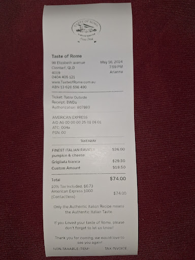 My wife and I cannot understand the positive reviews this place has unless it is family and friends doing it.When we visited it was a Saturday evening just gone! And there was nobody there! Which is a big red flag for me! But anyway we sat down and ordered a garlic pizza. This was very salty. Then the mains came out. Which was pasta Carbonara and spaghetti meatballs (the meat balls might have been vegan as they did not taste like meat at all) The dishes had a huge amount of Parmesan cheese coating the top) instead of offering it as a condiment) this killed any flavour if there was any there unfortunately). I don’t think there is a fully qualified chef here! And if there is he has lost his passion! This restaurant needs Gordan Ramsay to go through it and give them a taste of reality and tough love. My family and I only live about 5min drive from the restaurant and after driving past it hundreds of times decided to give it a go, Because from the outside a taste of Rome looks very good. Maybe it is just a pizza place we don’t know as we had dishes from the menu apart from the very salty garlic pizza we had for starters because they did not offer garlic bread!. The mains dishes were not fresh pasta it appeared to be days old. There was nothing fresh and the bacon in the carbonara was cheap bacon chips. The waitress did her job well bringing out the very bland food! But to be honest in the hour we were there she spent more time with her boyfriend in the kitchen! And when the only two walk ins that came in over the hour we were there! had to ring the bell for assistance! Then still wait a considerable time to take their order! And if they were uber eats drivers this is not worth the few dollars they get paid per delivery in waiting time. As I said Gordan Ramsay needs to go through here and teach them how to run a restaurant that has a great name like a taste of Rome! Because it is anything but a taste of Rome unfortunately!. We took a doggy bag away with us and our chooks are still slowly sifting through it. We paid nearly $100 for chook food unfortunately. I am sure the owners will come back with excuses! And I am very sorry to write this review! But if you are going to call yourself a taste of Rome! Promoting Authentic ingredients. Then you are setting the bar for quality very high! And I am sorry you guys you need a new chef and a complete makeover and quality control of the dishes you are offering!. I was so looking forward to this meal and it let me down so badly with my wife laughing at me! Because I made her come with me!. Please improve as I can only think you do not have to pay rent there because it is at the back of your house potentially! So if you had to pay rent. I think you would not be operating now!. And I am sorry to say that. But the truth...