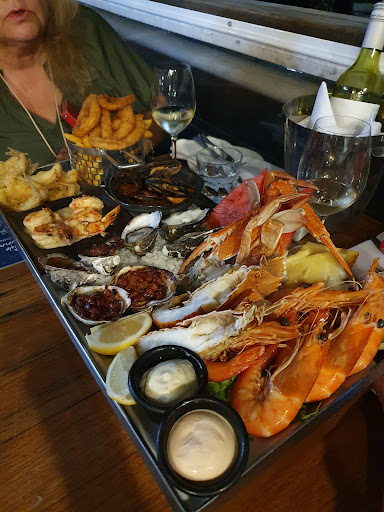 Each platter consisted of Moreton Bay bugs, hot garlic prawns, cooked cold prawns, battered whiting fillets, a pot of cooked mussels in a tomato-based sauce, sushi rolls with the associated accoutrement of pickled ginger and soy sauce, natural oysters, kilpatrick oysters, smoked salmon, calamari, mixed fruit, salad, and the best chips I've eaten in a long time.