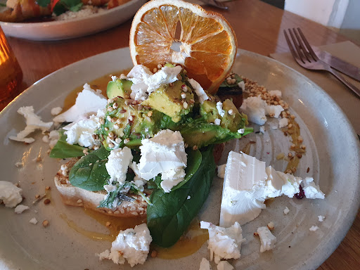 I chose the avocado on sourdough with added feta, (one of my all time fav options). This one came with a delicious spiced pumpkin addition with a lemony, tangy sauce on the side with a few pomegranate seeds and a dried orange segment. Flavours galore. Can't rave enough about this dish. And can I just add, when you ask for added feta...you actually get added feta. It seemed like half a block of feta..such good portion sizes and value for money.