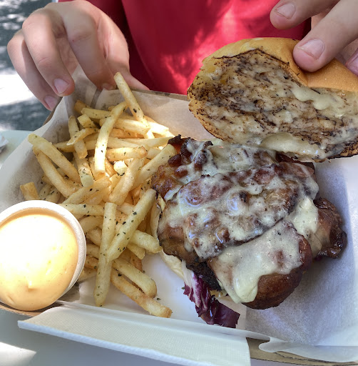 The Hamburger is further enhanced by a bed of crisp, fresh lettuce and a dollop of house-made tomato relish. The relish adds a touch of sweetness and tanginess, balancing the richness of the cheese and bacon while accentuating the natural flavors of the beef patty.