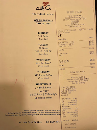 I have a lot of negative things to say about my experience at Little C's on Saturday night- horrible customer service both on the phone and in person, specifically the manager who couldn't even pretend to care, being lied to by staff, the order taking twice as long as they advised when I ordered, the quality going down so much since our last visit resulting in even my kids being unimpressed with our two dessert pizza's, their computer system apparently losing half my order but then the other half being ready to go elsewhere in the kitchen, etc. But the one thing I want to make sure you are aware of is the unhygienic behavior I witnessed in the kitchen. The kitchen is open to the public. I was waiting for my two takeaway pizzas when I witnessed a staff member in one part of the kitchen throw whipped cream without a lid on it across a walk way into another part of the kitchen. It fell onto the floor where the unlidded whipped cream would have touched the kitchen floor. The chef picked it, shook it and then went to spray it onto my pizza. He only stopped when I yelled at him to stop and was genuinely puzzled by me stopping him. However when I insisted, he did get a fresh bottle of whipped cream with its lid on to put on my pizza. While the teenage server who was the one who had thrown it, laughed hysterically. When I told him it wasn't funny, he told me to calm down. He himself calmed down and was immediately humbled when I asked to speak to the manager. If this is happening in clear sight of the customers, I worry what else is going on. I encourage everyone to avoid this restaurant. It is overpriced, the staff are horrible, the food is worse than any average takeaway pizza place and is prepared in an...