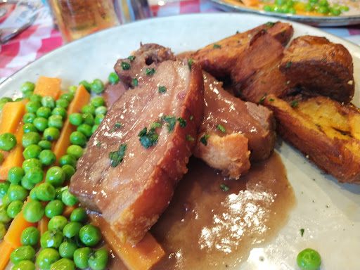 Next, we waited for mains, "Pancetta di Maiale" (Rosemary infused pork belly with a port wine ) and " Pollo al Marsala"( Chicken breast medallions panned with mushrooms , Marsala and cream) both severed served with Italian style potatoes and vage.