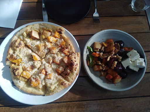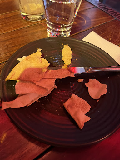 A very nice indoor setting with multiple seating options including very spacious booths. We had the fat chips w/ aioli and the Grazing Board with spicy capsicum dip instead of hommus. The missus also got the Tasmanian White Wine Flight. The chips were indeed thick and quite crunchy, seasoned well and generous in portion size. The aioli tasted like a slightly garlic mayonnaise though, which was a disappointment because the spicy capsicum dip was quite nice. Moving onto the pictured Grazing Board, the lamb (barely pictured on the right) was literally falling off the bone as we picked it up and was covered in a delicious saucey marinade. I was a fan of the karaage chicken, although my better half let me have the third and largest piece. I didn't really care for the pumpkin and feta arancini balls, but my partner liked them despite the unnecessarily spicy bolognese sauce beneath them, and the salad was a standard Greek, though I don't remember there being any feta in it. The bread was perfect, with the perfect balance of crunch and softness that tied very well with the capsicum dip. The calamari, however, was a bit of a disappointment when compared to all of the other local calamari offerings we had tried during our stay in Hobart. My partner seemed to enjoy the wines, but I'm not much of a drinker, so I can't really comment on that. All in all a decent experience, despite being given the old "not to rush you guys" at 9:40 when the website said closing time was 11. I would give a 4.5 if I...