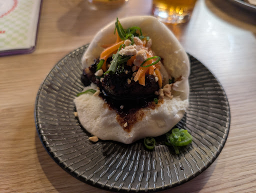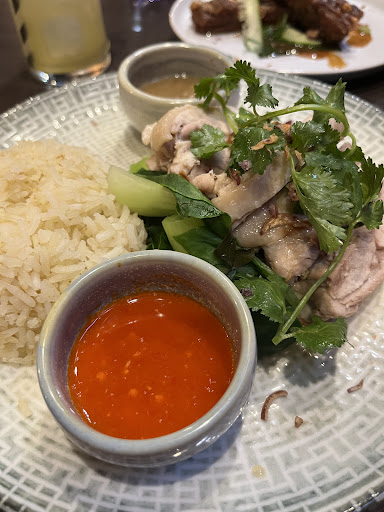 We had been looking forward to trying this restaurant for awhile so we booked for our 21st anniversary dinner. We arrived and were shown to our table. We asked to look at the drinks list before deciding. At this point we weren't given the menus so just sat there. We finally discovered that the paper place mat could be turned over to show the menu. We immediately saw the banquet option for $65 so decided to go for that as we like to trust the chefs and have always enjoyed degustations and banquets at other venues where you normally get a wide variety of dishes which represent the venue. We then waited for some time before getting someone's attention to take our drinks order and we ordered food at the same time. The banquet consisted of 1 bao bun each (pork), 1 rice paper roll each (tofu, dry and falling apart), 1 entree serve of salt and pepper calamari to share (tasty and well cooked) and 1 main serve of marinated chicken with rice to share (1 thigh piece and 2 legs). At this point the head waiter came over and told us we were ready for the last course which was dessert. He left to get our next drink order. We were very perplexed as to the value for $130 combined and the amount of food received. We called him over and asked for clarification, explaining what we had already had. He told us there were definitely more courses before dessert and left to talk to the kitchen. That gave us hope. The only other course that came out was a main chicken and potato curry with rice and roti (tasty) before we were both served a mango sticky rice dessert (absolutely delicious and authentic). The total price if we had ordered all dishes separately would have been $143, we paid $130 and received very basic and plain dishes compared to what was on the menu. It definitely didn't showcase their offerings. I would not recommend the venue based on the food we were served. I did however discover galangal gin and absolutely loved that - sadly the highlight...