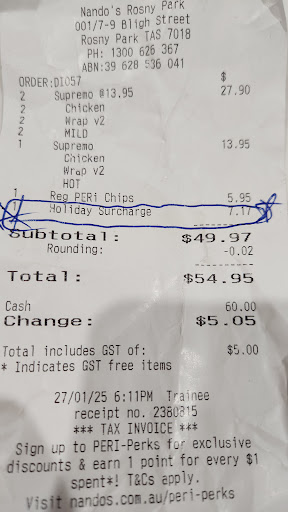 The response we received was that they were quiet and therefore wouldn’t cook any chicken. This just feels like an inadequate excuse for turning away customers. It's disappointing to see such a lack of hospitality and service at the Rosny location. I hope they can improve their approach to customer service...