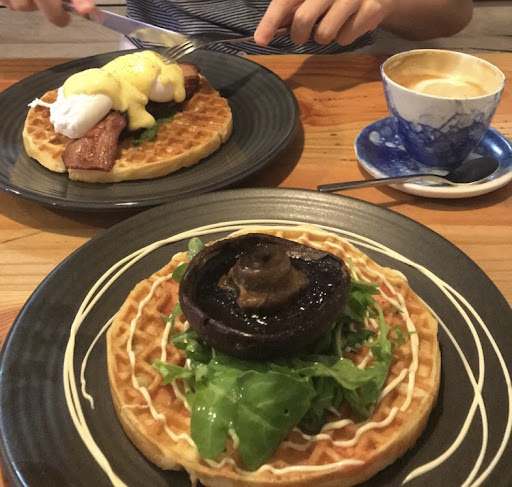 my partner and I decided to come to this cafe for brunch, and we were not disappointed! This cozy little cafe is tucked in the middle of Mathers Lane. It’s not noticeable if you’re driving on Liverpool St, but if you’re taking a stroll in the city, you might notice it. We sat down, expecting typical brunch food, Eggs Benedict, eggs on toast, etc. The menu wasn’t big, but there’s food you’d never expect to go well together! The last page of the menu showed sweet & savoury waffles. My partner and i decided to try something different, and he ordered the eggs benedict waffles, and i ordered smoked salmon & capers-filled waffles. It was amazing! We were pleasantly surprised about how well waffles go with savoury breakfast dishes. I highly recommend the smoked salmon & capers waffles, it’s something different from usual breakfast/brunch food, yet surprisingly tasty.
