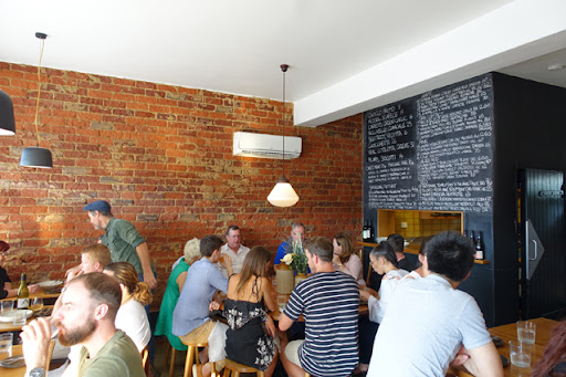 There are twenty-four seats, divided amongst high stools facing the tiled timber bar, low stools at a round, communal table, and a few coveted tables, with the lucky few in backed chairs facing their eating companions sitting along a banquette window seat. Exposed bricks, polished concrete floors and the golden light of the long Hobartian twilight gentled by blinds complete the picture.