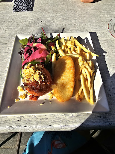 We sat outside, and it was beautiful in the sun, there was lots of cheeky birds eating other tables food after they had gone. I had the aracini and added a hashbrown. The aracini was delicious with a nice combination of spinach, tomato and rice. The salad was delicious, with a beetroot dressing on it that made it really fresh. The chips were a nice type of crispy and salty, however, I have a bias towards the classic thick chips, and didn't particularly like these thin chips but that's me. I took a Toblerone cheesecake home and that wad delicious. It was full of chocolate, but it wasn't too rich, and was just the right flavour of cheesecake and chocolate. I also had a hot chocolate which was delicious with thick foam. It wasn't too rich, which I love, and the chocolate powder tasted like quality powder. All in all, it was a lovely experience, and the staff were lovely, but it was very busy, and the wait time for staff to take dishes was a tad bit longer then it should be. It was worth the food and a lovely stop...