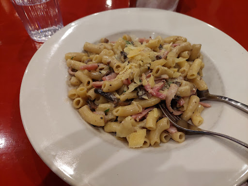 I ordered the carbonara with bacon and creamy mushroom sauce. I chose a table and grabbed some water and was served my meal after some time.