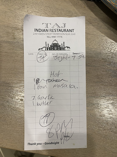 Ā Ā Ā Read moreI took a takeaway on Christmas day from Taj Indian. Taj Indian was one of the very few shops open on Christmas day. Given the crowd that descended on Huskinsson for a nice Christmas picnic, it was unsurprising that they were fully booked. Fortunately, they accepted our order for take-away. To me, the prices seemed a bit on the higher side but given that it was Christmas and the staff was working over a holiday to serve, I feel they were acceptable. However, after I tasted the food I came to the realisation that it was worth the penny. I ordered Palak paneer and garlic naan and I paired it with mango lassi. The Palak Paneer wasn't spicy or dripping with oil-my pet peeves with most of the palak paneers I've eaten in restaurant. The consistency of the gravy was smooth and the spice proportion was balanced- not too high to mask the taste of spinach and neither too low to seem bland. The garlic naan was soft and large. The lassi tasted fresh. The tanginess of the yogurt was blended with the sweetness of the mangoes. I found the portion sizes to be generous- neither myself nor my friends were able to finish our...