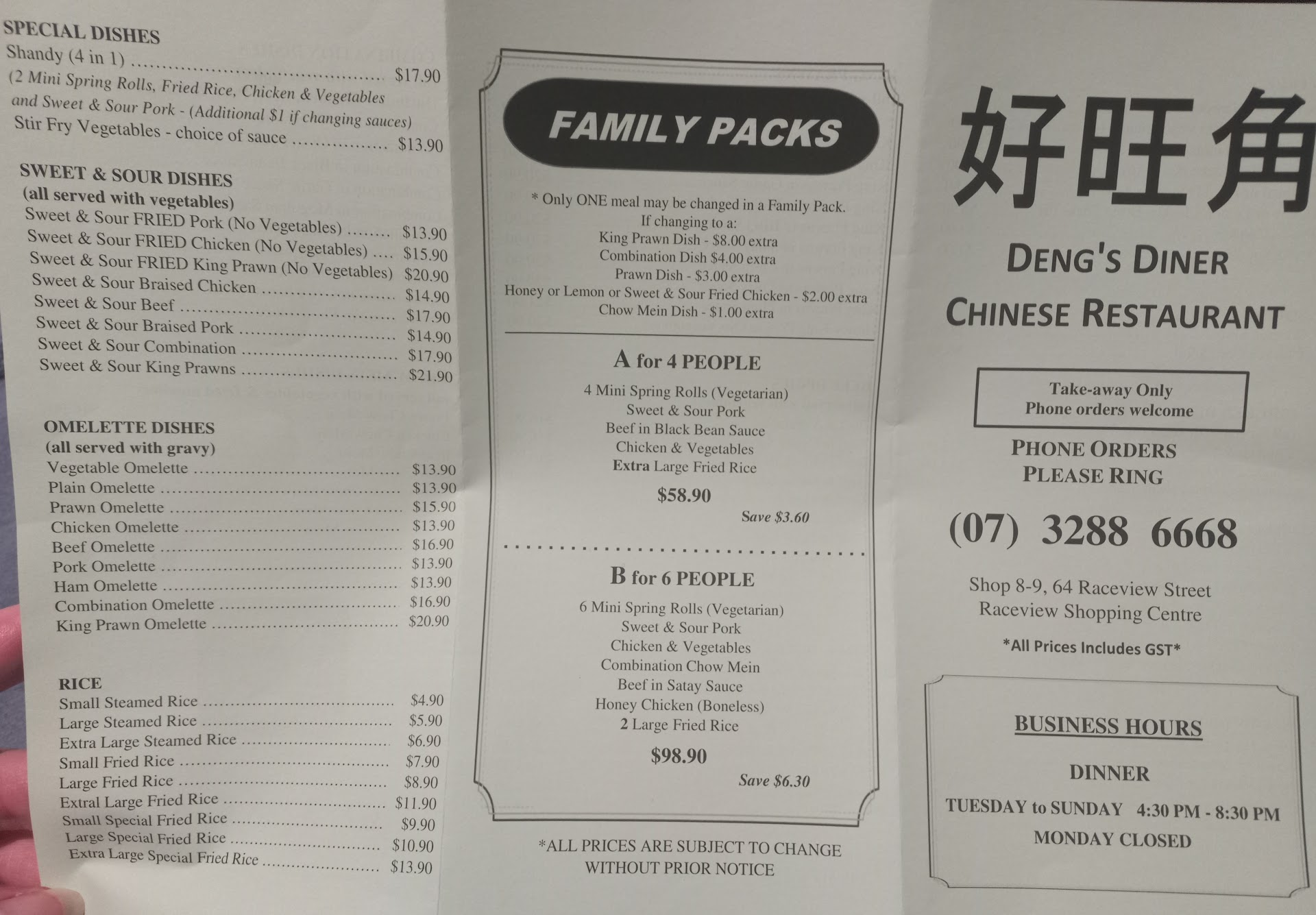 No stars at all. 4 People, Food was awful, cost too much, they have so many old menus up in web, cannot find a current, then found one that was this year so went with those prices, what a con, ordered food then son went and picked it up and paid, checked it and could not believe the price. Only thing in their favour was plenty of food, too much. No taste for Black Bean, or Combination Chow Mein , too cooked, not like Chinese cooking at all, I can do that bad with cooking chinese. Dog is getting the rest as we had a hard time eating any, all I can say it was just awful and for that much money would definitely not recommend them to anyone. I read the reviews first, that is why I decided to get it from Deng's but never again. Chinese cooking is a clean flavour. This was mushy. Got the 4 Steamed Dim Sims and they were not nice...