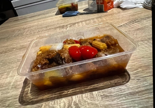 The plastic container only had a few onions, carrots, and a couple of corn kernels. Each portion of beef contained just four pieces—this is absolutely outrageous! I have never seen such a terrible meal before. The portion size was ridiculously small, completely insufficient, and definitely not worth the price.
