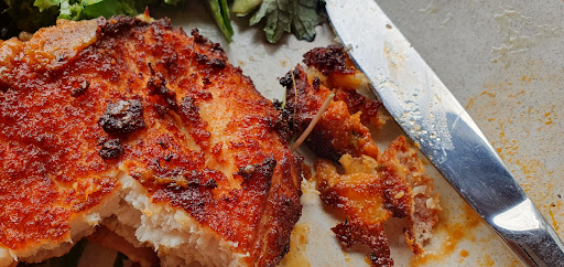 Finally when our lunch arrived the meal looked to be a good large size. Cutting into the Parmigiana the chicken was very dry and the crumb and meat was burnt black particularly around the edges. This made nearly half of the chicken inedible-see photos.