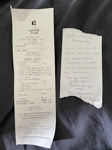 Read moreI ordered both today and yesterday from this store because I have been really unwell and unable to cook for myself all week. I am so overwhelmed with how wonderful the service has been that I had to leave a review to tell everyone else! Also, the food is always amazing from any Coffee Club I visit and is always as expected, if not better.