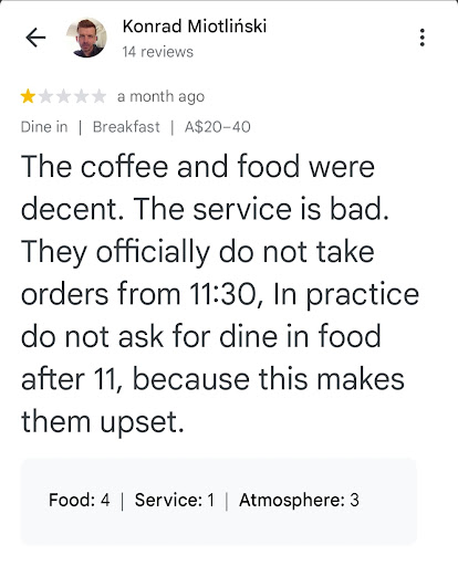 Yeah hi. This would have been the morning of the 24th of July, which is obviously a little while back now . I was meaning to post a review the day after but figured it wasn't worth the effort.The reason I posted it now was that your Cafe came up in conversation and so I decided I'd go through with the review. No biggie. Like I said the food was good and you've got a nice little spot there, but when you're forking out $50 plus for some breakfast, you want to...