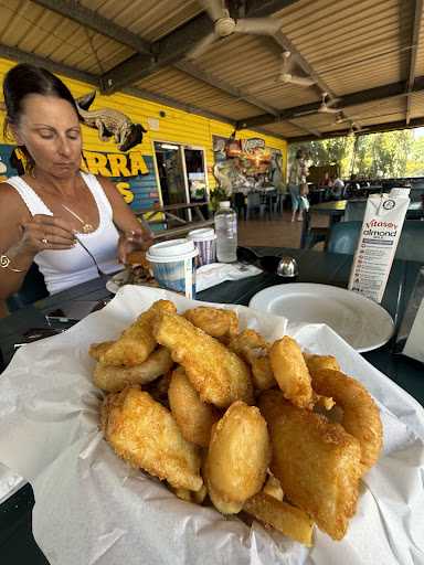 Biggest disappointment at Karumba! Shame my phone was flat inside the glove compartment in the ute, so I didn't take a picture, but anyway, we ordered two pieces of battered barramundi, two potato scallops and half a scoop of chips (as we normally do everywhere we go and it is always more than enough for the two of us) to take away. About the fish, it was, let's say, kind of one an a half portion of two very flat pieces of fish. One of the pieces was actually smaller than my hand (with fingers closed together), and I've only got small hands. Il was a bit thicker than the potato scallops and very greasy. The potato scallops were the thinnest I've ever had and were also quite soggy. About the chips, which were only small, by the way: The half scoop of chips would have been enough for one person, so as we were both very hungry, but my husband had been working a lot harder than me the whole day, so I had 10 small chips and left the rest of the chips for him (I'm not sure there were 20 left though). And I had the the small piece of fish and told him I only wanted to try the scallops, so he could have them. I'm glad we had been to the shop the day before, so I had an apple for dessert, and he had a full...