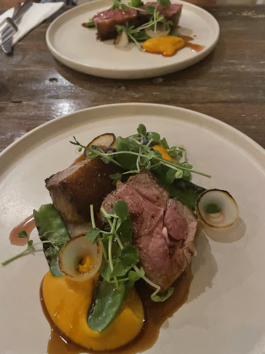 Two courses ($49/person) for me kicked off with kingfish crudo, adorned with an unusual topping of cucumber, sour cream and parsnip, dotted shiny black roe. Quirky, but it worked to showcase the firm-fleshed fish. Barbequed pork neck—slow cooked and served with red cabbage and nectarine with a scattering of pumpkin seeds—eats well and is more generously proportioned than my photo implies. Salt baked gnocchi was the standout—crisp green snow peas and a creamy quenelle kept it from being too salty, and the tiny pillows of potato were perfectly cooked. It edged out the duck breast served under nicely wilted greens.