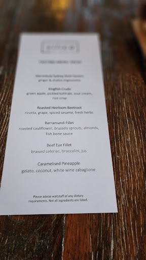 Read moreWe couldn't get into our first choice of restaurant so we made a reservation for Silica and we were not disappointed! We had the 6 course tasting option. We started with the Merimbula Sydney Rock Oysters with ginger and shallot mignioutte. Fresh, dressing well balanced left us wanting more! King Fish Crudo - Green apple, pickled Kohlrabi, sour cream and a rice crisp - the rice crisp was so delicate, the kingfish and the condiments together were a burst of heaven in our mouth. Couldn't wait for the roasted heirloom beetroot and didn't disappoint. The barramundi fillet, skin was crisp, the barramundi perfectly cooked, cauliflower puree silky and smooth. The beef eye fillet perfectly cooked and so tender you could cut it with a butter knife, our dessert caramelised pineapple was a perfect way to end our meal. The only criticism we had was that the cutlery was not changed between each course, just taken off our plate and placed on our serviette. If you are in town do yourself a favour...