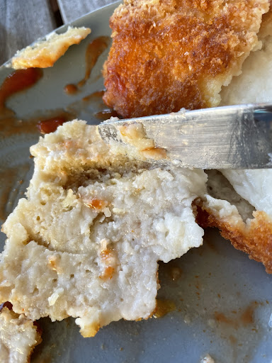 My wife elected for the crumbed fish thinking it was a healthier option...had a chuckle when we saw that the 'crumbed' fish is actually battered first, then rolled in the crumbs, so it's actually a double-whammy...sorry wifey. When we cut into the fish, the batter on the inside was still raw (see picture), and the crumbs on the outside were burnt.
