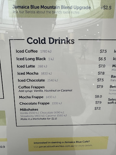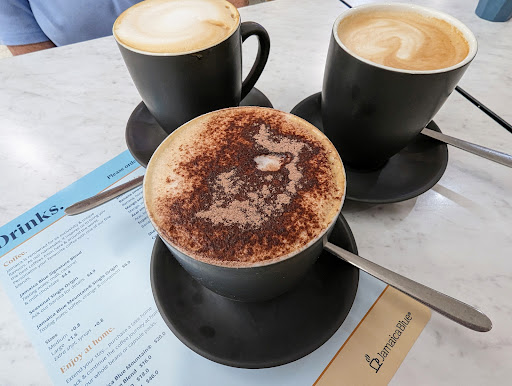 Read moreWhen we arrived at Jamaica Blue there were plenty of seats to choose from. I ordered at the counter and although there was only one person working there at the time, the service was quick. I ordered a half strength Cappuccino, it was lovely and creamy with plenty of froth but next time I will order full strength as it was way too weak in taste. One of my friends ordered a normal strength Latte and although she enjoyed it she said that she would have enjoyed it more if it had been stronger. The 3rd coffee that was ordered was a normal strength flat white which my friend has often at other cafes and he said that the coffee strength was just right and was nice and creamy. I was very lucky to be able to invite 2 friends along to sample Jamaica Blue's coffee and I have given my honest opinion and passed onto you what my friends...