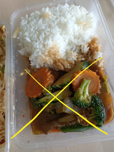 I bought a ginger chicken stir-fry, a jasmine rice, and some fish cakes. Rice was well cooked but notably a bit too expensive for a small rice compared to other Thai restaurant prices fish cakes were fine The ginger chicken stir-fry… tasted like dirt! When we asked the chef what was wrong with the taste he said that sometimes ginger tastes like dirt!(?)