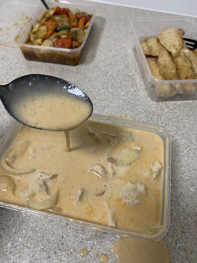 I bought a ginger chicken stir-fry, a jasmine rice, and some fish cakes. Rice was well cooked but notably a bit too expensive for a small rice compared to other Thai restaurant prices fish cakes were fine The ginger chicken stir-fry… tasted like dirt! When we asked the chef what was wrong with the taste he said that sometimes ginger tastes like dirt!(?)
