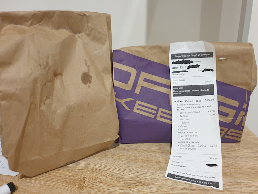 I wish I could give this place less than 1 star. I had receive my order and had missing items, chips and drink. When I called the restaurant they accused me of lying and that they had reported me to uber claiming to have video evidence of them placing the missing items in the package. I had to call the uber driver, tip him extra to return with the item. As you can see on the origin bag, the staples indicate where the restaurant had stapled the bag closed to prevent tempering, this contained my kebab plate. The 2nd photo shows the additional bag with the chips and drink that was supposedly placed inside the orgin bag (i had to tip the driver extra to return with this). Now how was that supposed to fit inside the origin bag underneath the staples ? Honestly the most upsetting incident ever experienced with a restaurant. I would honestly love to see this so called "video evidence" horrible customer service. To top it off, I didn't even get my requested utensil, I'm at work and requested them...